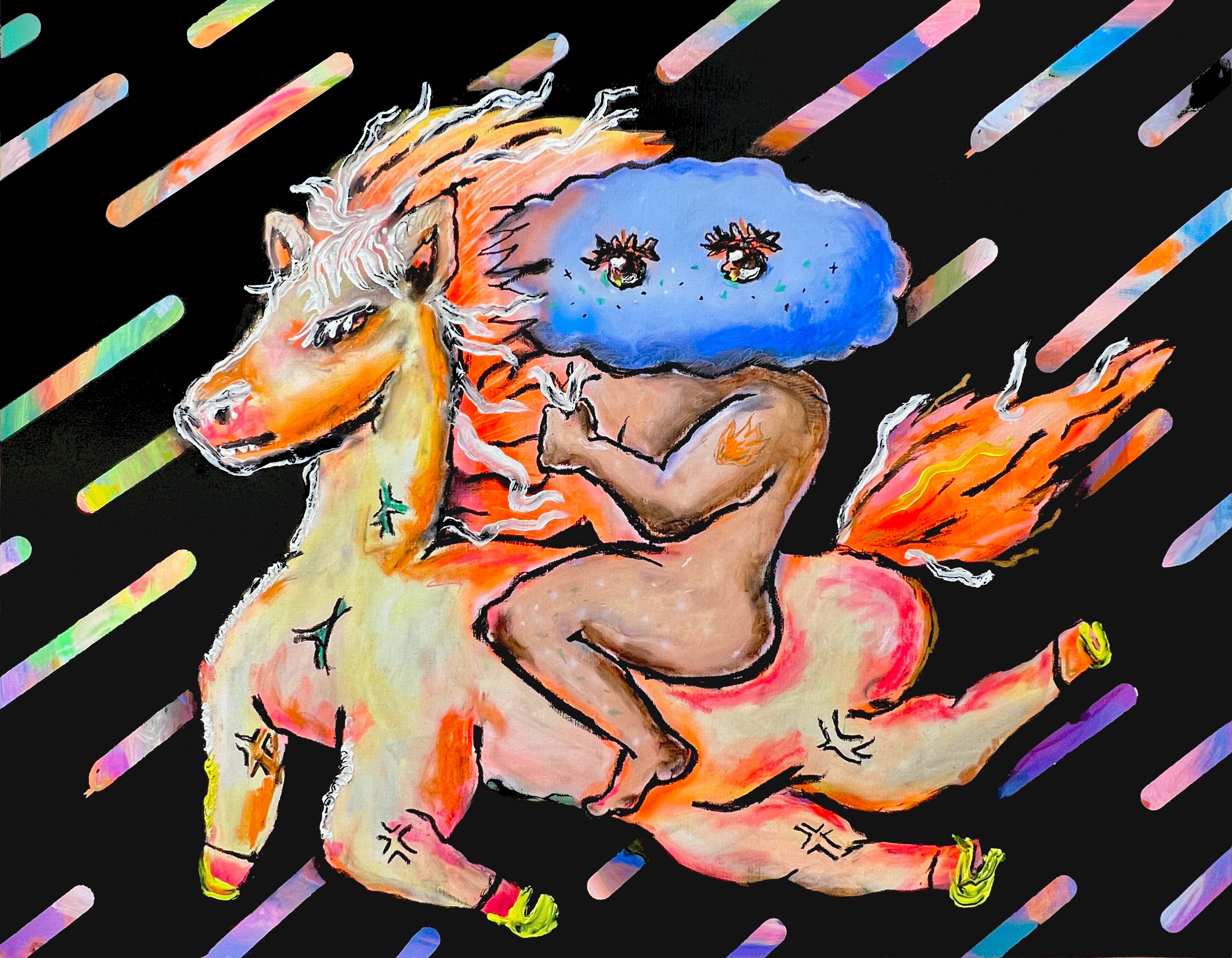 백마와 함께2022 | 116.8 x 91 cm | Acrylic , Oil paint and Oil pastel on canvas 입이 없는 구름은 백마를 타고 시간을 건너는 중이다. 어려서부터 타인의 눈치를 많이 보았던 것 같다. 내 감정이나 의사 표현에 익숙하지 않아서 울며 겨자 먹는 날이 꽤 많았다. 30여 년의 습관이 한순간에 바뀔 수는 없지만 그래도 조금씩 나를 새로운 길로 (좋은 길인지는 모르겠지만) 인도해 준 것들을 구름과 함께 그렸다. 빠른 년생이라 주민번호가 89로 시작하는 친구들과 달리 90년에 태어난 것에 굉장히 뿌듯해했고 아직도 그렇다. 더 좋았던 것은 내가 말띠, 백마 띠라는 사실! 영화 <반지의 제왕> 속 엘프들이 타고 다니는 백마를 항상 가슴에 품고 나와 동일시했다. 무언가 정말 원하는 것이 생겼을 때, 생각하고 참고를 반복하다가 포기가 안 될 때는 백마를 떠올렸다. 고등학교 2학년이 갑자기 미대가 가보고 싶어졌을 때, 직장을 그만두고 싶었을 때, 외국에서 일해보고 싶었을 때, 취업 대신 가게를 내보고 싶었을 때, 그림 전시회를 하고 싶었을 때... 나는 그냥 질렀다. 백마니까 과감하게 앞만 보는 거야! 실패하면 어쩔 수 없지. 하지만 반전! 내가 2월 생이기에 친구들처럼 황사 노란 뱀띠라는 것을 다 커서 알았다. 그래서 배경에 슬쩍 뱀을 그려 넣었다. OUNJU 운주
