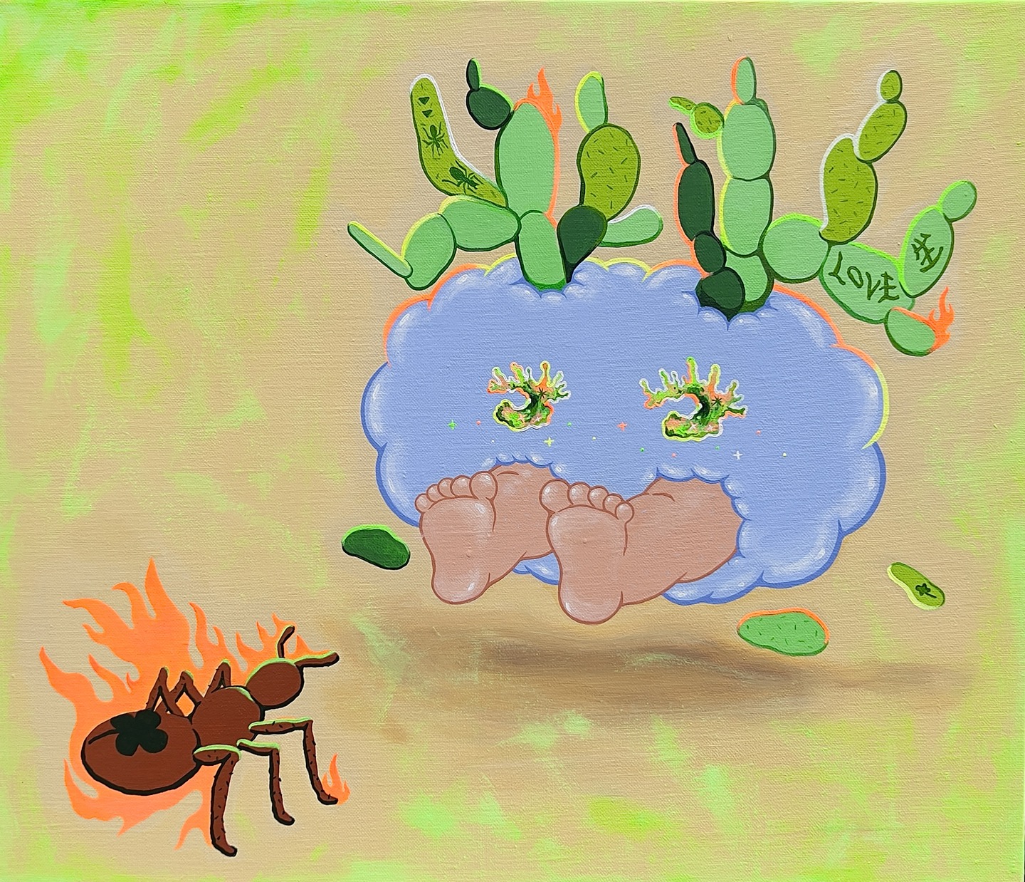 <생명력의 형태> 주변의 생물에서 인간의 모습을 발견하는 것을 좋아한다.주변 사람에게서 연예인 닮은 꼴 찾기도 내 특기다. 그중 곤충에 관심을 갖기 시작 한 건 몇 년 전 가을이었다.바람이 거센 가운데 코스모스에 달라붙어 꿀을 모으고 있는 꿀벌을 보았다.10분 정도 관찰했을까? 90도로 꺾였다가 휘청거리는 꽃에 아랑곳하지 않고 자기 일을 하고 있었다. 주변에 사람이 있든 말든,바람에 밀려 원래 앉으려던 꽃 옆의 꽃에 안착하던 말던,꺾이는 꽃들에 자신이 위태롭든 말든,그냥 일만 하는 모습이 대단하기도 하고 미련해 보이기도 하고 복잡한 마음이 들었다. 그렇게 2020년 디지털을 이용한 벌레 인간 시리즈를 그렸었다. 2023년 봄,코로나가 끝나고 난 뒤 끈질기게 살아있던 식물들을 방구석에서 발견했다. 몇 번의 겨울을 버텨낸 존재들이 내 공간 속에서 숨죽이며 지내고 있었다. 좁은 화분 속, 틈도 없이 뚫고 올라와 사방으로 뻗어나간 스투키꾸역꾸역 새로운 잎을 내면서도 매일 우수수 떨어진 꽃잎들로 바닥이 지저분하던 은행목한 밤 자고 일어나면 조그만 혹들이 자라나 복잡한 모양이 되어가는 다육 선인장 살고자 했던 노력들은 꽤나 끈질기고 괴상한 모습으로 생물들을 진화시켰다.(소녀였던 엄마들이 세월을 지나오면서 단단하고 억센 모습으로 진화하며 가족을 지탱하듯...) 운주_은행목_2023_Acrylic & Mixed media on Linen_91x91cm '은행목’은 그중 하나로 그 생명력을 닮고 싶은 구름의 모습을 표현했다. 떨어지는 잎들 사이로 구름에게서 초록색 아우라가 펼쳐진다. 그 주변으로 삶과 버팀에 관한 생각들을 낙서로 표현했다. 입체 낙서는 평면적인 일상에서 떠오르는 생각들을 나타낸다. 산다는 것이 무엇인지에 답하기 위한 과정을 시각적으로 나타낸다. 왼: 운주_어떤개미_2023_Acrylic paint on Linen_2023_53 x 45.5cm 생명력 식물 시리즈 중 하나인 ‘어떤 개미’는 작가의 방이 개미로 뒤덮였던 옛날 기억에서 나왔다.바닥을 가득 메우며 방을 점령했던 개미군단은 퇴치 후에도 몇 번이고 다시 들어왔다.매일이 전쟁이었지만 방어와 공격을 반복하다보니 징그러운 개미들과도 끝은 있었다. 정찰병 한 마리를 놓치면 순식간에 수 백마리가 쳐들어오는 대담함,끊임없이 쳐들어오는 끈질김, 살기 위한 움직임은 징그러움을 넘어 대단하다는 존경의 마음을 들게했다. 오: 운주_어떤거미_2023_Acrylic paint on Linen_2023_53 x 45.5cm 현재 작업실에는 거미줄이 곳곳에 숨어있다.청소를 해도 일주일 뒤에 보면 숨은 공간 안에 또 집을 지어놨다. 평소엔 몸을 숨기고 있고 날벌레도 잡아주니 개미보단 낫다. 그런 의미에서 거미줄, 거미의 집이 계속 생겨나는 일들은 살고자 하는 노력의 연속인 것이다.'은행목'에도 거미줄이 가득 등장한다. 구름은 거미와 개미를 만나 그 끈질김과 생명력의 힘에 매료당했고 자신도 닮고 싶다고 생각했다. 욕망의 불씨가 타올랐다. 운주 OUNJU2023.06.10